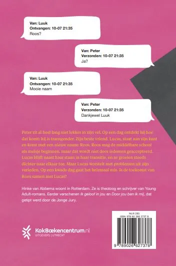 Peter snapt lange tijd niet wat er met hem aan de hand is en waarom hij zo in de war raakt als hij op school bij de jongens wordt ingedeeld. Op een dag ontdekt hij hoe dat komt: hij is transgender. Zijn beste vriend Lucas accepteert het direct en komt met een nieuwe naam: Roos. Na de zomervakantie begint Roos op de middelbare school als meisje, maar dat wordt niet door iedereen geaccepteerd. Gelukkig staat Lucas naast haar bij elke stap die gezet moet worden in de transitie. Roos en Lucas groeien steeds dichter naar elkaar toe, maar Lucas heeft zelf ook zijn eigen problemen en moet dealen met zijn verleden. Op een kwade dag gaat het helemaal mis. Is de toekomst van Roos samen met Lucas?