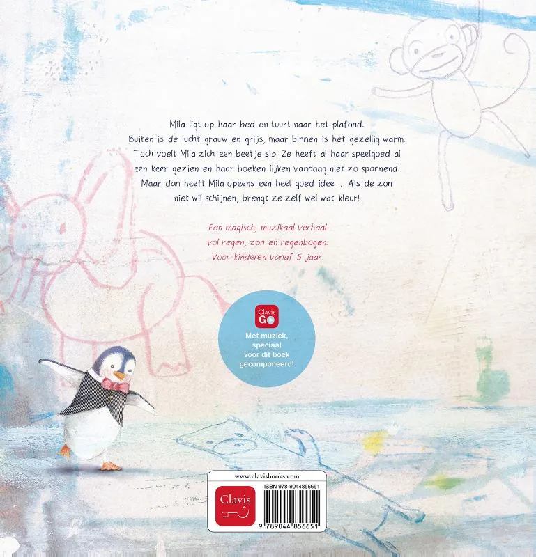 Mila ligt op haar bed en tuurt naar het plafond. Buiten is de lucht grauw en grijs, maar binnen is het gezellig warm. Toch voelt Mila zich een beetje sip. Ze heeft al haar speelgoed al een keer gezien en haar boeken lijken vandaag niet zo spannend. Maar dan heeft Mila opeens een heel goed idee … Als de zon niet wil schijnen, brengt ze zelf wel wat kleur!