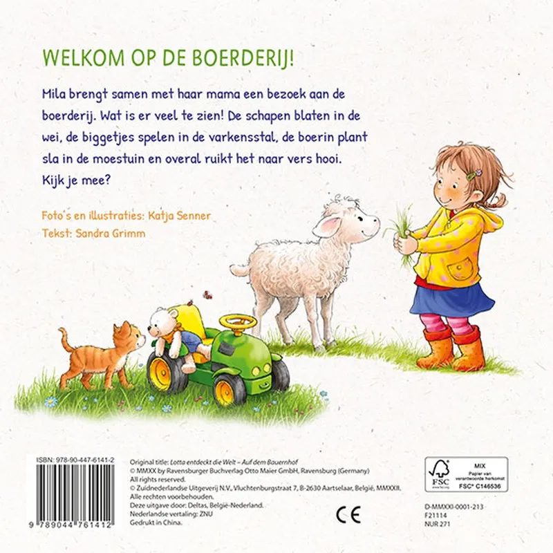 Ontdek samen met Mila in dit leuke kartonboekje een heleboel boerderijdieren. De schapen blaten in de wei, de biggetjes spelen in de varkensstal en de kippen scharrelen rond in het kippenhok. Kijk je mee? Ideaal als eerste kennismaking met de boerderij en de dieren die er leven.