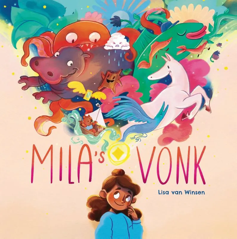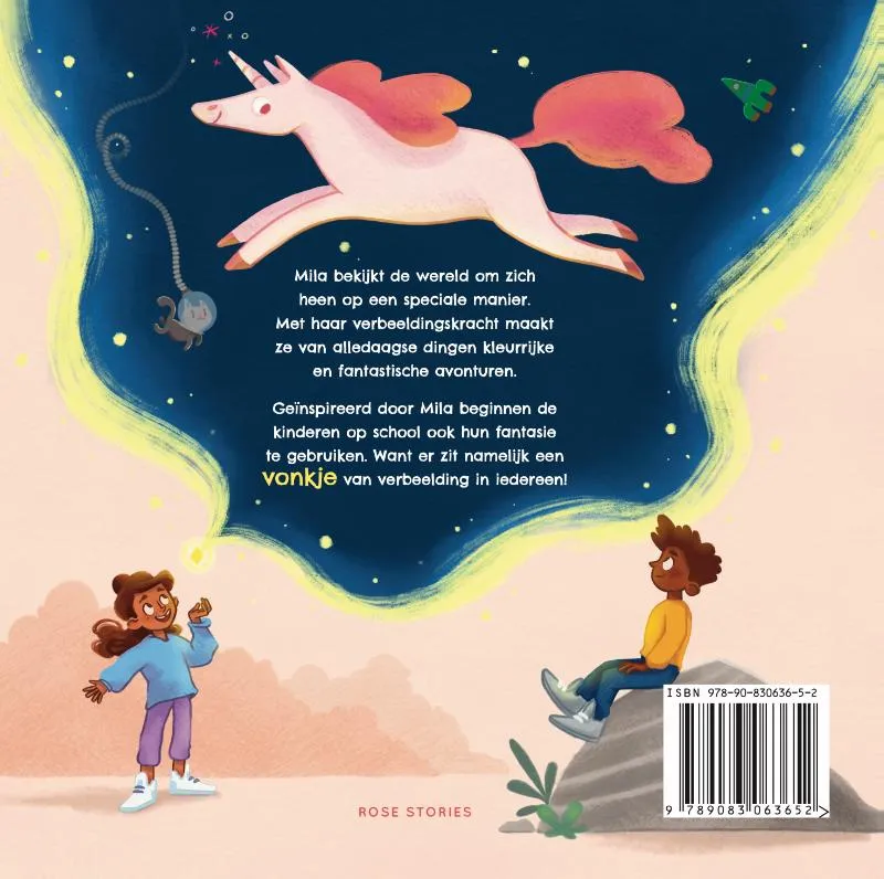 Mila bekijkt de wereld om zich heen op een speciale manier. Met haar verbeeldingskracht maakt ze van alledaagse dingen kleurrijke en fantastische avonturen.Geïnspireerd door Mila beginnen kinderen ook hun fantasie te gebruiken. Want er zit namelijk een VONKJE van verbeelding in iedereen!
