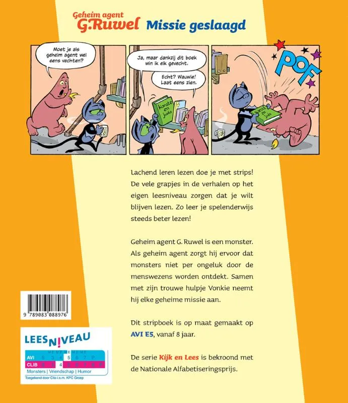 De grappige strips in dit AVI-stripboek gaan over de avonturen van de beste agent van de Geheime Monster Dienst: Geheim agent G. Ruwel. Samen met zijn assistent gaat hij geen enkele geheime missie uit de weg! <br>Dit grappige AVI-stripboek heeft een harde kaft en is op maat geschreven om te oefenen met lezen. <br><br>• Cito gecertificeerd op AVI E5, vanaf 8 jaar. <br>• Van de maker van de populaire stripreeks Joep. <br>• De serie Kijk en Lees is bekroond met de Nationale Alfabetiseringsprijs. <br>• CO2-neutraal gedrukt op FSC-papier.