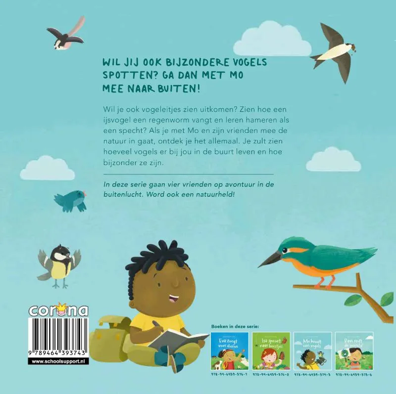 Wil je ook vogeleitjes zien uitkomen? Zien hoe een ijsvogel een regenworm vangt en leren hameren als een specht? Als je met Mo en zijn vrienden mee de natuur in gaat, ontdek je het allemaal. Je zult zien hoeveel vogels er bij jou in de buurt leven en hoe bijzonder ze zijn.