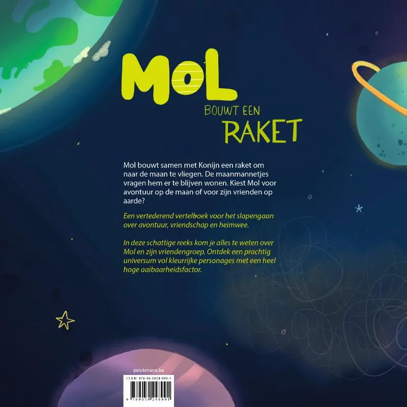 Mol bouwt samen met Konijn een raket om naar de maan te vliegen. De maanmannetjes vragen hem er te blijven wonen. Kiest Mol voor avontuur op de maan of voor zijn vrienden op aarde?