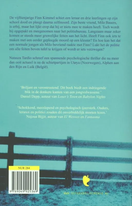 De vijftienjarige Finn Kimmel schiet een leraar en drie leerlingen op zijn<br>school dood en pleegt daarna zelfmoord. Zijn beste vriend, Milo Bauers,<br>is erbij, maar het lijkt erop dat hij er niets mee te maken heeft. Toch wordt<br>hij opgepakt en meegenomen naar het politiebureau. Langzaam maar zeker<br>komen er steeds meer gruwelijke feiten aan het licht. Heeft Finn ook iets te<br>maken met een eerder gepleegde moord op een kleuter? En hoe kan het dat<br>een normale jongen als Milo bevriend raakte met Finn? Lukt het de politie<br>om alle feiten boven tafel te krijgen of wordt er iets verzwegen?<br><br>Natasza Tardio schreef een spannende psychologische thriller die nu meer<br>dan ooit actueel is na de schietpartijen in Utøya (Noorwegen), Alphen aan<br>den Rijn en Luik (België).