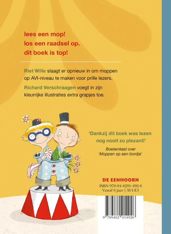 Na de twee succesvolle moppenboeken Moppen op een bordje en Een mop met een bij bij slaagt Riet Wille er opnieuw in om moppen, raadsels en grapjes op AVI-niveau te vertalen voor prille lezers. Richard Verschraagen voegt in zijn kleurrijke illustraties extra grapjes toe.