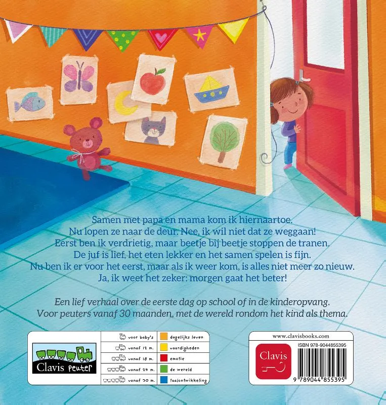 Samen met papa en mama kom ik hiernaartoe.Nu lopen ze naar de deur. Nee, ik wil niet dat ze weggaan!Eerst ben ik verdrietig, maar beetje bij beetje stoppen de tranen.De juf is lief, het eten lekker en het samen spelen is fijn.Nu ben ik er voor het eerst, maar als ik weer kom, is alles niet meer zo nieuw.Ja, ik weet het zeker: morgen gaat het beter! Een lief verhaal over de eerste dag op school of in de kinderopvang. Voor peuters vanaf 30 maanden, met de wereld rondom het kind als thema.