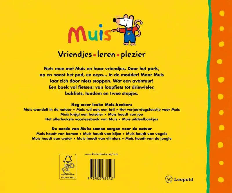 In Muis gaat fietsen leer je op een vrolijke manier fietsen met Muis. Dit populaire karakter, bedacht door Lucy Cousins, is in 2025 35 jaar oud.