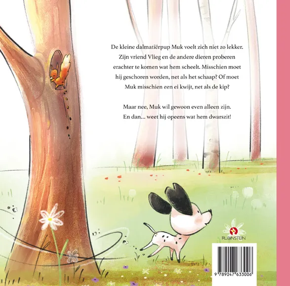 De kleine dalmatiërpup Muk voelt zich niet zo lekker. Zijn vriend Vlieg en de andere dieren proberen erachter te komen wat hem scheelt. Misschien moet hij geschoren worden, net als het schaap? Of moet Muk misschien een ei kwijt, net als de kip? Maar nee, Muk wil gewoon even alleen zijn. En dan… weet hij opeens wat hem dwarszit!