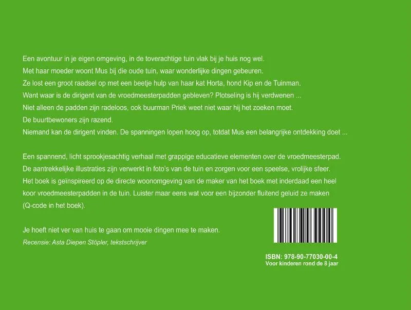 Een spannend, licht sprookjesachtig verhaal met grappige educatieve weetjes over de vroedmeesterpad. De aantrekkelijke illustraties zijn verwerkt in foto’s van de tuin en zorgen voor een speelse, vrolijke sfeer.