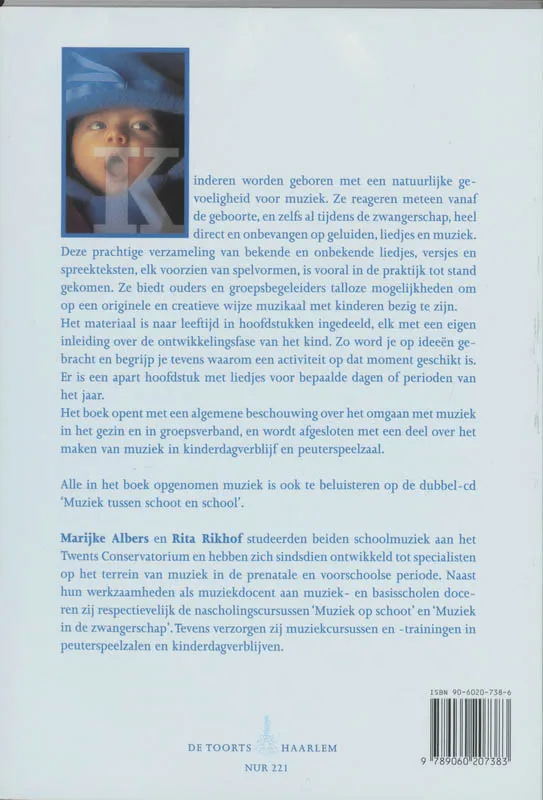 Kinderen worden geboren met een natuurlijke gevoeligheid voor muziek. Ze reageren meteen vanaf de geboorte, en zelfs al tijdens de zwangerschap, heel direct en onbevangen op geluiden, liedjes en muziek. Deze verzameling van een honderdtal bekende en onbekende liedjes, versjes, spreekteksten en luisterfragmenten, elk voorzien van spelvormen, biedt ouders en groepsbegeleiders talloze mogelijkheden om op een originele en creatieve wijze muzikaal met kinderen bezig te zijn. In het boek is ook het notenbeeld van de liedjes afgebeeld.