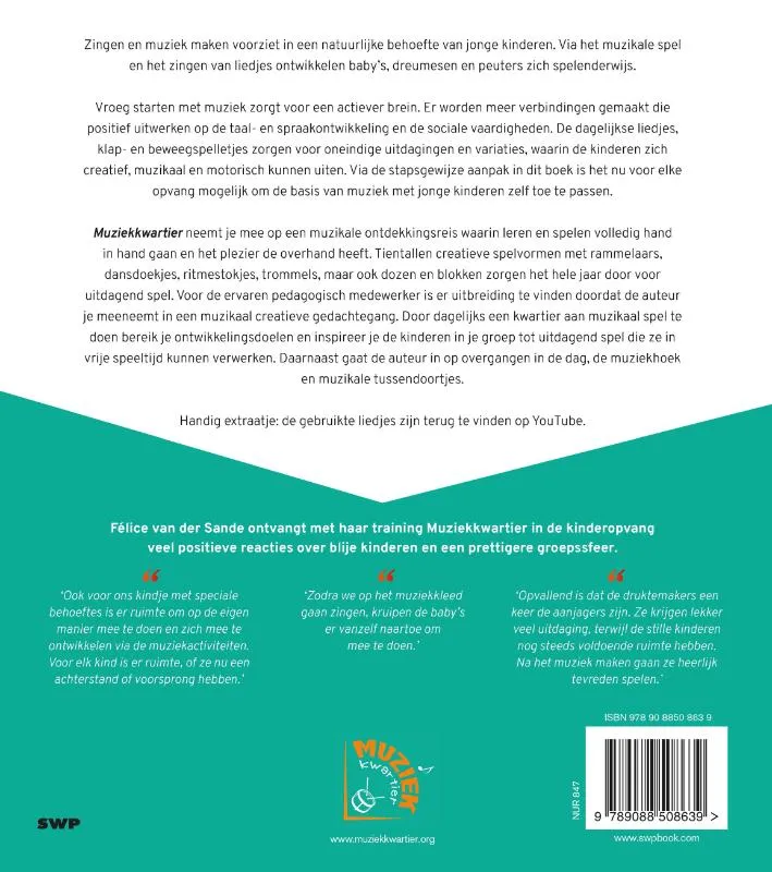 Muziekkwartier neemt je mee op een muzikale ontdekkingsreis waarin leren en spelen volledig hand in hand gaan en het plezier de overhand heeft. Tientallen creatieve spelvormen met rammelaars, dansdoekjes, ritmestokjes, trommels, maar ook dozen en blokken zorgen het hele jaar door voor uitdagend spel. Voor de ervaren pedagogisch medewerker is er uitbreiding te vinden doordat de auteur je meeneemt in een muzikaal creatieve gedachtegang. Door dagelijks een kwartier aan muzikaal spel te doen bereik je ontwikkelingsdoelen en inspireer je de kinderen in je groep tot uitdagend spel die ze in vrije speeltijd kunnen verwerken. Daarnaast gaat de auteur in op overgangen in de dag, de muziekhoek en muzikale tussendoortjes.