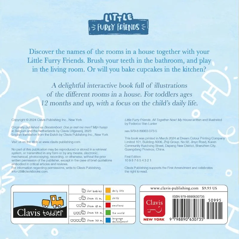 Discover the names of the rooms in a house together with your Little Furry Friends. Brush your teeth in the bathroom, and play in the living room. Or will you bake delicious cupcakes in the kitchen? A delightful interactive book full of illustrations of the different rooms in a house. For toddlers ages 12 months and up, with a focus on the child’s daily life.