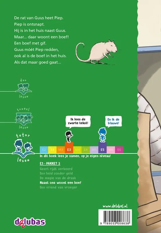 Naast ons woont een boef is een boek uit het E3 pakket 2 tutorlezen van Uitgeverij Delubas, speciaal ontwikkeld voor tutorlezen, met E3 als leesniveau voor de beginnende of zwakkere lezer.