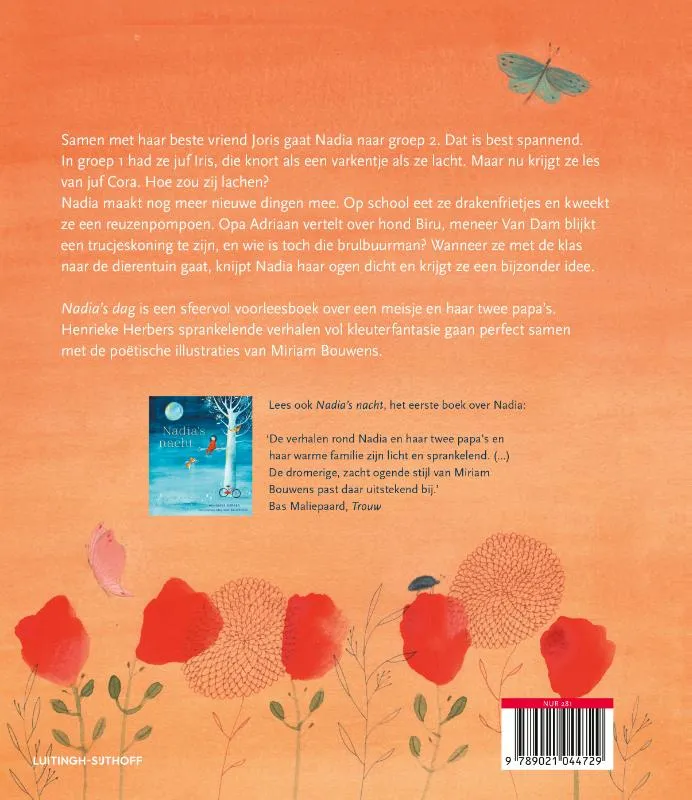 Nadia’s nacht van auteur Henrieke Herber en illustrator Miriam Bouwens heeft een vervolg: Nadia’s dag. In dit sfeervolle en los te lezen voorleesboek voor kleuters beleeft Nadia allerlei avonturen met haar twee papa’s. Door de korte, afgeronde belevenissen is dit boek perfect om elke dag uit voor te lezen.