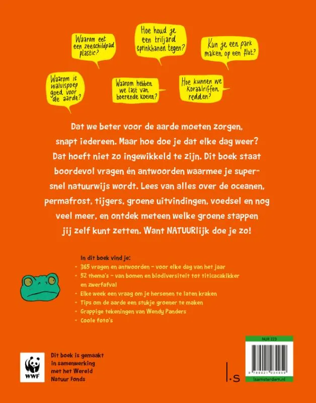 Met NATUURlijk doe je zo zet jij een stap in de groene richting! Want in dit superleuke boek, dat gemaakt is in samenwerking met het Wereld Natuur Fonds en PatsBoem!, worden al jouw vragen over de natuur beantwoord én ontdek je hoe je zelf de aarde een stukje groener maakt. Met grappige tekeningen van Wendy Panders en aansprekende foto’s.