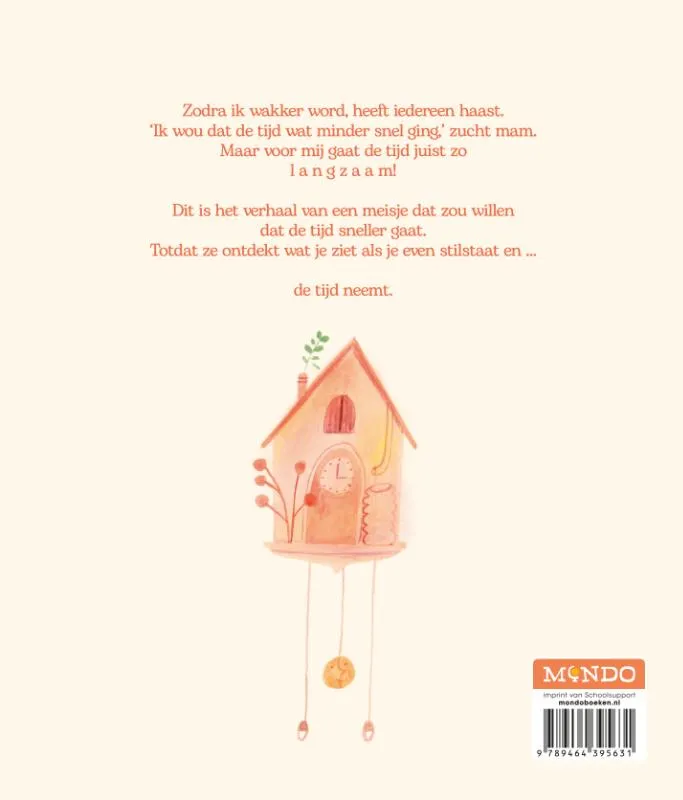 Zodra ik wakker word, heeft iedereen haast. ‘Ik wou dat de tijd wat minder snel ging,’ zucht mam.Maar voor mij gaat de tijd juist zo l a n g z a a m!Dit is het verhaal van een meisje dat zou willen dat de tijd sneller gaat.Totdat ze ontdekt wat je zit als je even stilstaat en … de tijd neemt.