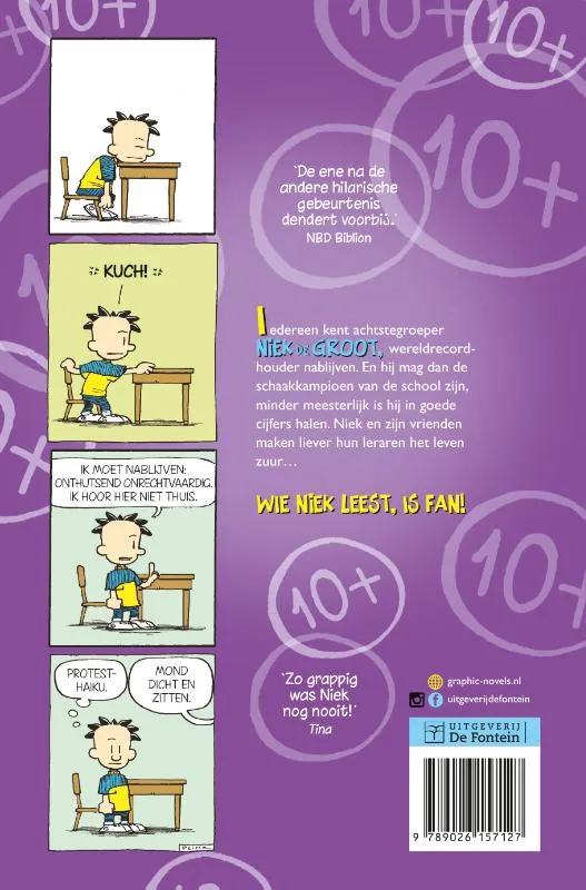 Achtstegroeper Niek de Groot, wereldrecordhouder nablijven, is terug met een serie supergrappige strips waarvan je over de grond rolt van het lachen. Iedereen kent achtstegroeper Niek de Groot, wereldrecordhouder nablijven. En hij mag dan de schaakkampioen van school zijn, minder meesterlijk is hij in goede cijfers halen. Niek en zijn vrienden maken liever hun leraren het leven zuur…
