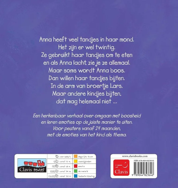 Anna heeft al veel meer tandjes dan haar kleine broertje Lars. Als ze boos is, bijt ze Lars wel eens. Maar dat mag niet, Anna! Prentenboek met eenvoudige tekeningen in kleur. Vanaf ca. 2 jaar.