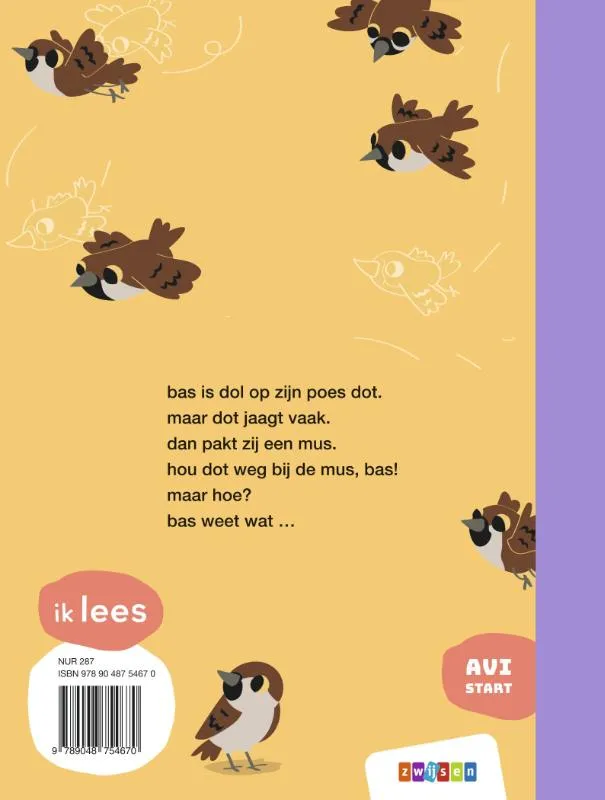 bas is dol op zijn poes dot.<br>maar dot jaagt vaak.<br>dan pakt zij een mus.<br>hou dot weg bij de mus, bas!<br>maar hoe?<br>bas weet wat …<br><br>Poezen houden van jagen. En bas houdt van zijn poes dot. Maar bas houdt er niet zo van als dot jaagt op vrolijk fluitende musjes. Dus besluit hij om ervoor te zorgen dat dot geen andere diertjes kan vangen. Maar hoe houd je een poes tegen? Nieuwsgierige lezers kunnen niet wachten om daar achter te komen. Schrijfster Mandy Pijl heeft het verhaal zo opgebouwd dat kinderen de korte hoofdstukken graag uit willen lezen. Alleen dan weten ze hoe dit herkenbare avontuur afloopt. Nancy Kers maakte de illustraties bij dit verhaal op AVI Start niveau.