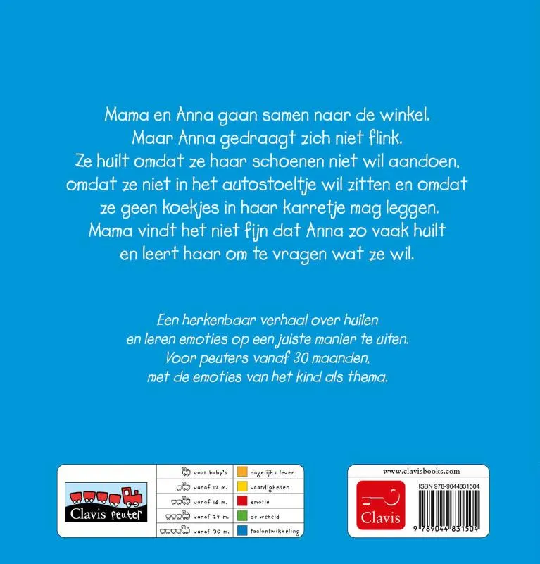 Mama en Anna gaan samen naar de winkel. Maar Anna gedraagt zich niet flink. Ze huilt omdat ze haar schoenen niet wil aandoen, omdat ze niet in het autostoeltje wil zitten en omdat ze geen koekjes in haar karretje mag leggen. Mama vindt het niet fijn dat Anna zo vaak huilt en leert haar om te vragen wat ze wil.