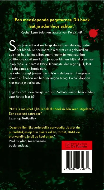 Niet mijn naam van Megan Lally is een bloedstollende jeugdthriller met een onverwachte plotwending. Voor fans van Mel Wallis de Vries en lezers vanaf 13 jaar die van spannende boeken houden.<br> <br> Stel: je wordt wakker langs de kant van de weg, onder het bloed. Je hebt geen idee wat er gebeurd is en wie je bent. Een agent neemt je mee naar het politiebureau. Al snel komt je vader binnen; hij is al uren naar je op zoek. Je naam is Margot Boone. Tenminste, dat zegt hij. Hij laat je geboorteakte en familiefoto's zien.<br> Je vader brengt je naar zijn huisje in de bossen. Langzaam komen er flarden van herinneringen terug. En die kloppen niet met zijn verhalen…<br> <br> Ergens wordt een meisje vermist. Zal haar vriend haar vinden voor het te laat is?<br> <br> 'Een meeslepende, emotionele pageturner. Dit boek laat je ademloos achter.'<br> Rachel Lynn Solomon, auteur van De Ex Talk<br> <br> 'Niets is zoals het lijkt. Ik heb dit boek in één keer uitgelezen. Een absolute aanrader!'<br> Lezer op NetGalley<br> <br> <br>