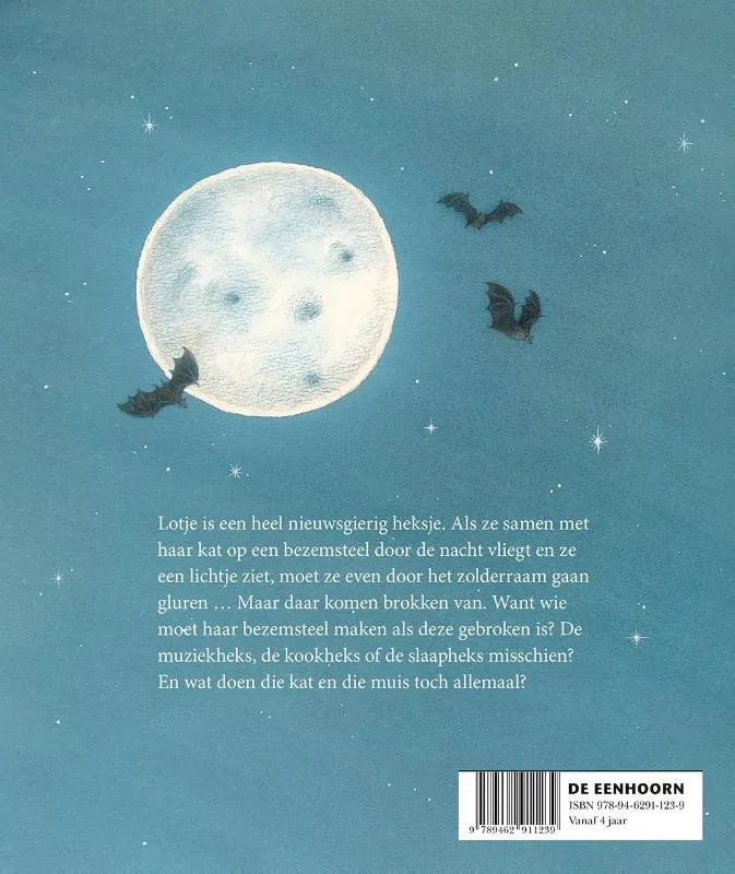 Lotje is een heel nieuwsgierig heksje. Als ze op een bezemsteel door de nacht vliegt en een lichtje ziet, wil ze even door het zolderraam gluren … Maar dan valt ze door het raam de zolder binnen. Haar bezemsteel is stuk. Wie kan hem maken? Lotje daalt af in het grote huis en ontmoet in elke kamer een andere heks: de muziekheks, de kookheks, de slaapheks … Wie kan haar helpen?