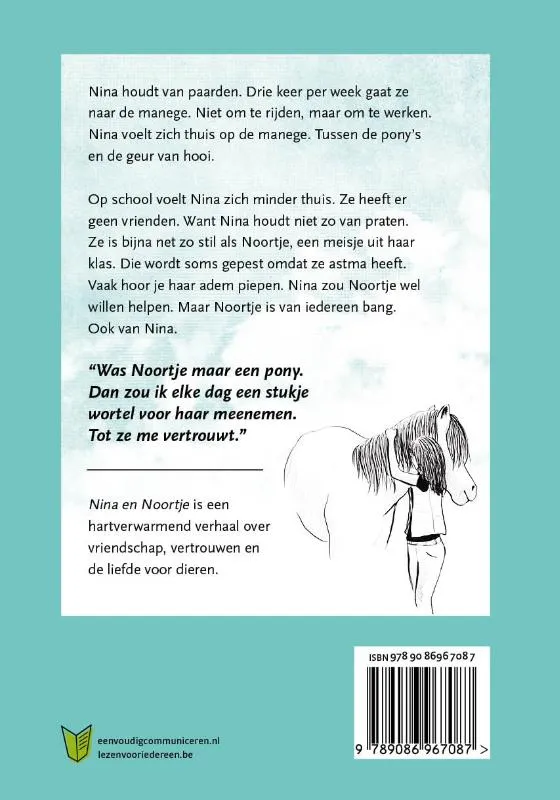 Nina werkt liever op de manege dan dat ze naar school gaat. Ze probeert vrienden te worden met Noortje, een meisje uit haar klas dat gepest wordt. Verhaal in korte zinnen en gemakkelijke woorden. Met zwart-witillustraties. Vanaf ca. 10 jaar.