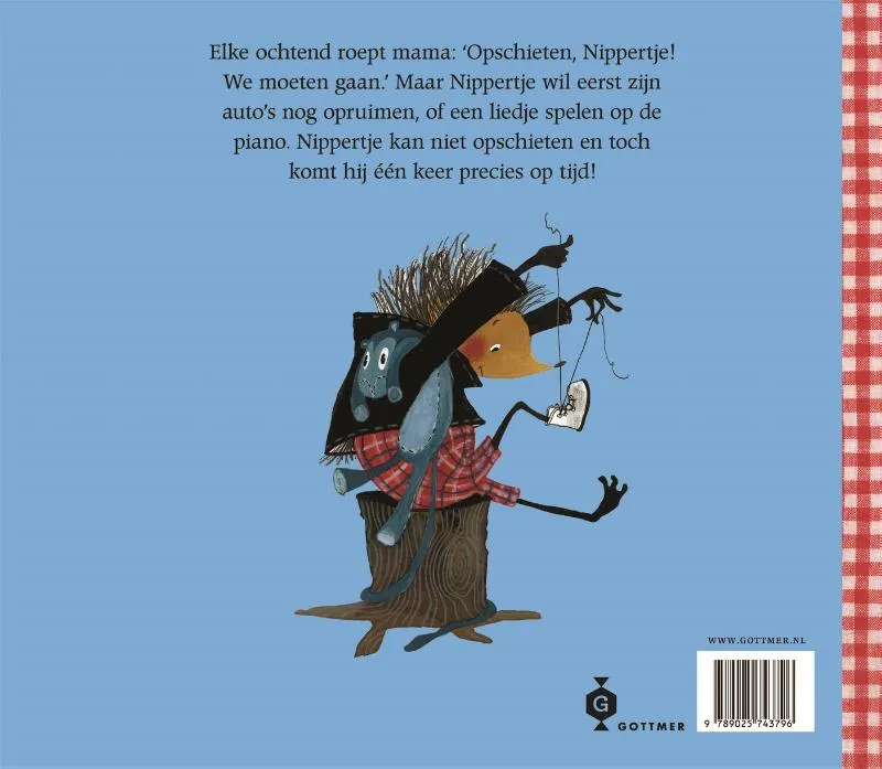 Elke ochtend hetzelfde liedje: het is tijd om naar school te gaan maar Nippertje wil nog even een liedje oefenen op de piano, zijn cavia moet nog eten, de auto’s moeten in de garage worden gezet en zijn rechterschoen is zoek. Het is een situatie die veel ouders bekend voor zal komen. Vol humor laat Rian Visser ons zien dat een beetje treuzelen en dromen zo gek nog niet is en soms meer oplevert dan dat eeuwige gehaast.