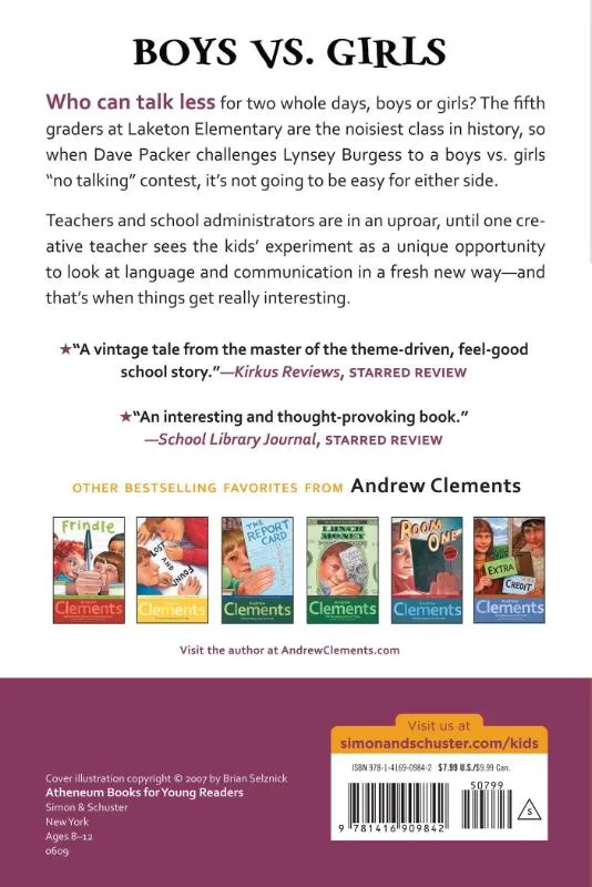 It&;s boys vs. girls when the noisiest, most talkative, and most competitive fifth graders in history challenge one another to see who can go longer without talking. Teachers and school administrators are in an uproar, until an innovative teacher sees how the kids&; experiment can provide a terrific and unique lesson in communication. In No Talking, Andrew Clements portrays a battle of wills between some spunky kids and a creative teacher with the perfect pitch for elementary school life that made Frindle an instant classic.