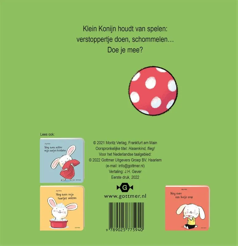 In ‘Nog even samen spelen’, een lief prentenboekje van Jorg Mühle, wordt voorlezen een interactief spel. Peuters laten zelf het konijntje omhoogvliegen op de schommel en spelen verstoppertje met hem.