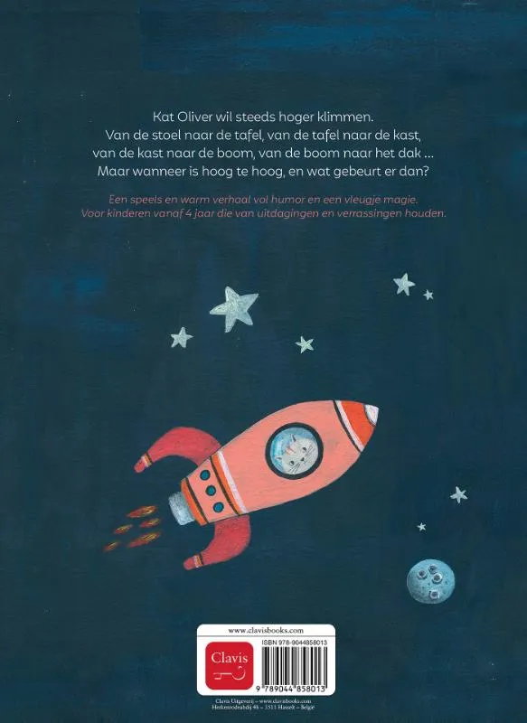 Kat Oliver wil steeds hoger klimmen. Van de stoel naar de tafel, van de tafel naar de kast, van de kast naar de boom, van de boom naar het dak … Maar wanneer is hoog te hoog, en wat gebeurt er dan?Een speels en warm verhaal vol humor en een vleugje magie.Voor kinderen vanaf 4 jaar die van uitdagingen en verrassingen houden.
