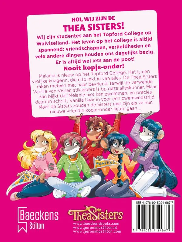 Melanie is nieuw aan het Topford College. Het is een vrolijke knagerin, die uitblinkt in van alles. De Thea Sisters sluiten meteen vriendschap met haar, maar de verwende Vanilla van Vissen is stikjaloers op deze alleskunner. Een van de weinige dingen die Melanie niet kan is zwemmen, en precies daarom schrijft Vanilla haar in voor een zwem-estafette. Maar de Sisters zouden de Sisters niet zijn als ze hun nieuwe vriendin kopje-onder lieten gaan.