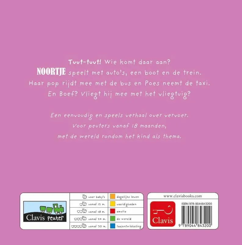 Tuut-tuut! Wie komt daar aan? Noortje speelt met auto’s, een boot, en de trein. Haar pop rijdt mee met de bus en Poes neemt de taxi. En Boef? Vliegt hij mee met het vliegtuig?
