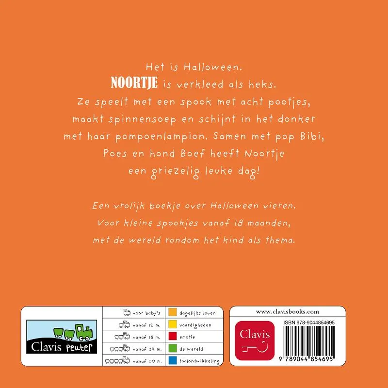 Het is Halloween. Noortje is verkleed als heks. Ze speelt met een spook met acht pootjes, maakt spinnensoep en schijnt in het donker met haar pompoenlampion. Samen met pop Bibi, Poes en hond Boef heeft Noortje een griezelig leuke dag!