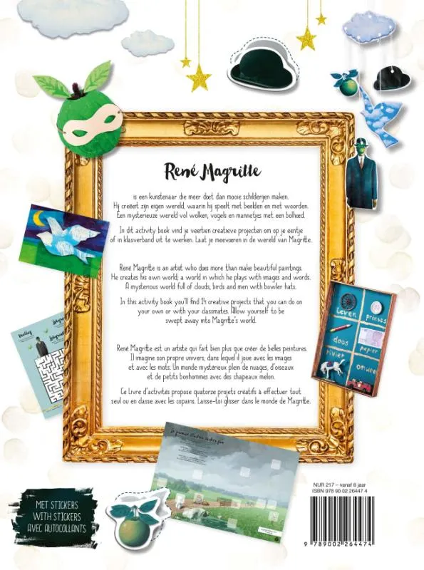 René Magritte is een kunstenaar die meer doet dan mooie schilderijen maken. Hij creëet zijn eigen wereld, waarin hij speelt met beelden en met woorden. Een mysterieuze wereld vol wolken, vogels en mannetjes met een bolhoed.In dit activity book vind je veertien creatieve projecten om op je eentje of in klasverband uit te werken. Laat je meevoeren in de wereld van Magritte.René Magritte is an artist who does more than make beautiful paintings. He creats his own world; a world in which he plays with images and words. A mysterious world full of clouds, birds and men with bowler hats.In this activity book you’ll find 14 creative projects that you can do on your own or with your classmaths. Allow yourself to be swept away into Magritte’s world.René Magritte est un artiste qui fait bien plus que créer de belles peintures. Il imagine son propre univers, dans lequel il joue avec les images et avec les mots. Un monde mystérieux plein de nuages, d’oiseaux et de petits bonhommes avec des chapeaux melon.Ce Livre d’activités propose quatorze projets créatifs à effectuer tout seul ou en classe avec les copains. Laisse-toi glisser dans le monde de Magritte.