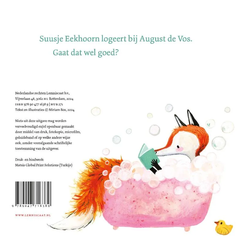 Voor hun jongere broertjes en zusjes maakte Miriam Bos een kartonboekje waarbij Suus de boel weer flink op stelten zet. Ze komt logeren bij August. Of die daarop zit te wachten is maar de vraag… Wordt het een leuk logeerpartijtje of kan Suus voortaan beter thuisblijven? Eén ding is zeker: het is nooit saai met zo’n stuiterende eekhoorn op bezoek!