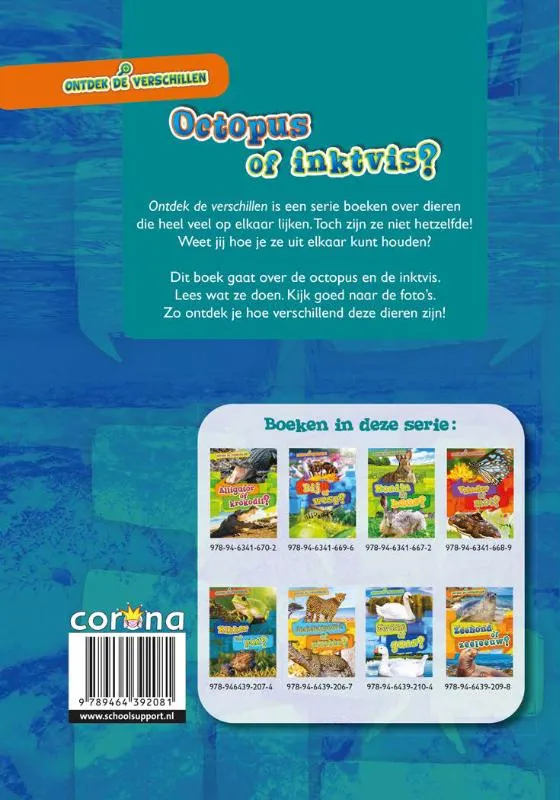 Dit boek gaat over de octopus en de inktvis. Lees wat ze doen. Kijk goed naar de foto’s. Zo ontdek je hoe verschillend deze dieren zijn!