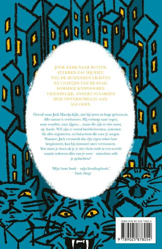 Overal waar Jock Martijn kijkt, ziet hij steen en hoge gebouwen. Alle natuur is verdwenen. Hij verlangt naar regen, naar wouden, naar tijgers… maar die zijn er niet meer, op Aarde. Wél zijn er overal beeldschermen, systemen die alles registreren, en huisrobots die voor je zorgen. Wanneer Jock vermoedt dat zijn eigen robot hem bespioneert, kan hij niemand meer vertrouwen. <br>