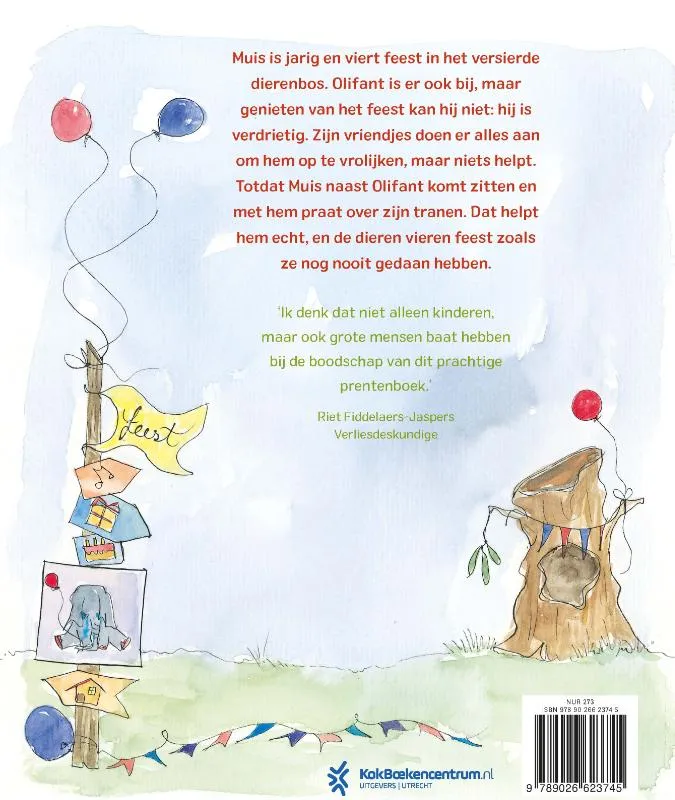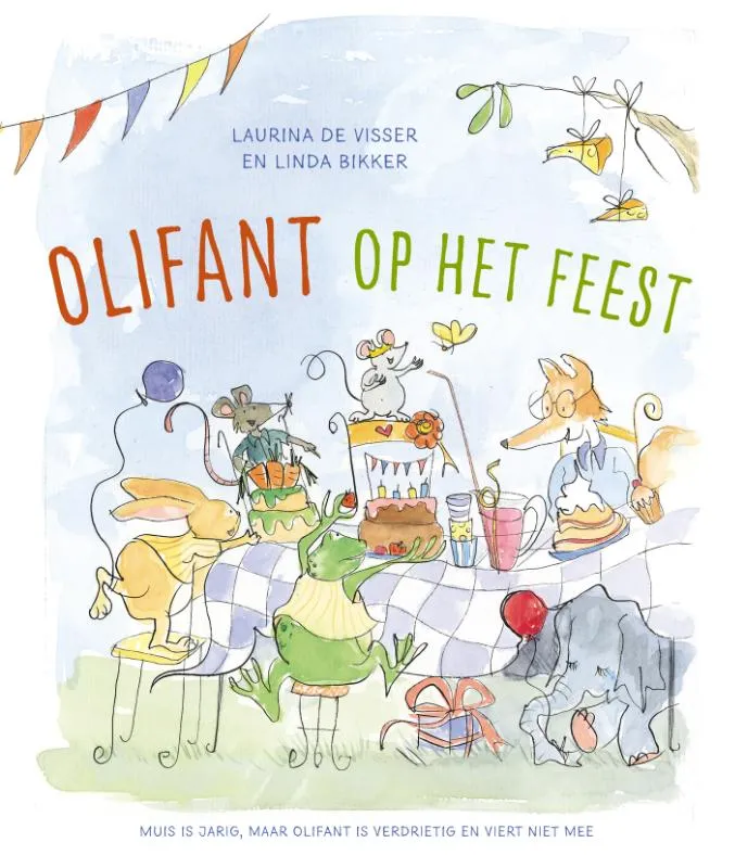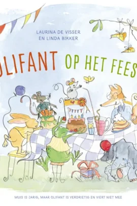 Het prentenboek ‘Olifant op het feest’ van Laurina de Visser en Linda Bikker gaat over Muis, die jarig is en een feestje in het versierde dierenbos viert. Olifant is er ook bij, maar genieten van het feest kan hij niet: hij is namelijk verdrietig. Zijn vriendjes doen er alles aan om hem op te vrolijken, maar niets helpt. Totdat Muis naast Olifant gaat zitten en met hem praat over zijn tranen. Een prachtig prentenboek over een lastig onderwerp, dat ons leert dat we verdriet niet zomaar kunnen oplossen, maar juist de ruimte moeten geven. Want wanneer er ruimte ontstaat om verdriet te laten zijn, dan is er zomaar de kans dat het ook weer weggaat.