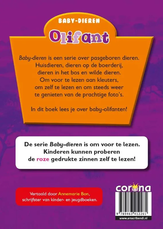 Baby-dieren is een serie over pasgeboren dieren. Huisdieren, dieren op de boerderij, dieren in het bos en wilde dieren. Om voor te lezen aan kleuters, om zelf te lezen en om steeds weer te genieten van de prachtige foto’s.