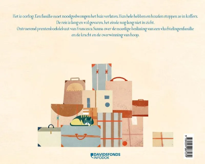 Het is oorlog. Een familie moet noodgedwongen het huis verlaten. Hun hele hebben en houden stoppen ze in koffers. De reis is lang en vol gevaren, het einde nog lang niet in zicht. Ontroerend prentenboekdebuut van Francesca Sanna over de moedige beslissing van een vluchtelingenfamilie en de kracht en de overwinning van hoop.
