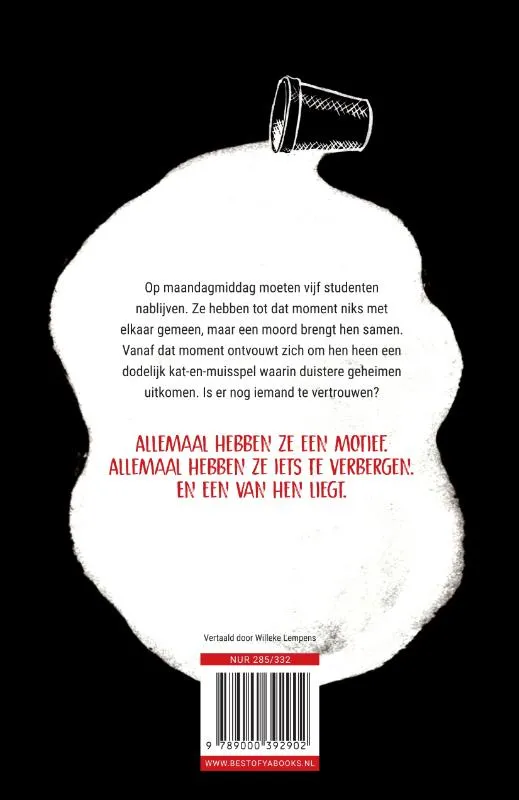 Op maandagmiddag moeten vijf studenten nablijven. Ze hebben tot dat moment niks met elkaar gemeen, maar een moord brengt hen samen. Tegelijkertijd ontvouwt zich om hen heen een dodelijk kat-en-muisspel waarin duistere geheimen uitkomen. Is er nog iemand te vertrouwen?