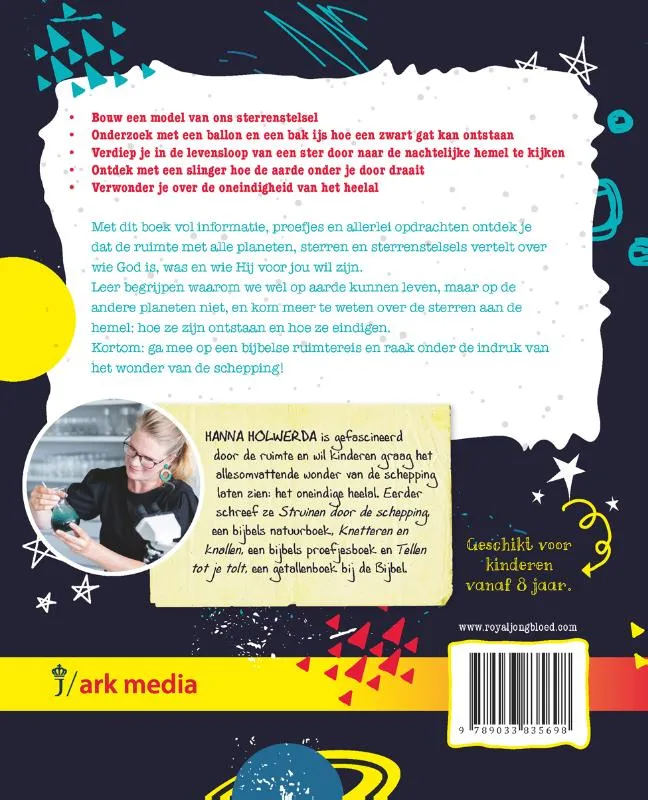 Dit boek vol informatie, proefjes en allerlei opdrachten laat kinderen ontdekken dat de ruimte met alle planeten, sterren en sterrenstelsels vertelt over wie God is, was en wie hij voor hen wil zijn. Ze mogen mee op ontdekkingsreis en zullen onder de indruk komen van de oneindige grootheid van het heelal. Begrijpen waarom we wel op aarde kunnen leven en op de andere planeten niet. En meer te weten komen over de sterren: hoe ze zijn ontstaan en hoe ze eindigen. ‘Ontdek het oneindige heelal’ zal hen diep versteld doen staan over het wonder dat schepping heet!