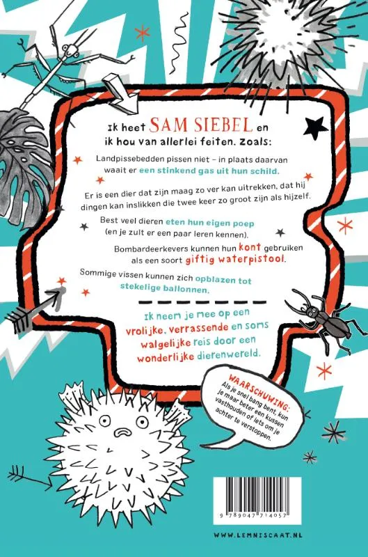 Sam Siebel heeft twee wandelende takken (Takkie en Jakkie), een hamster (Letty) en een goudvis die luistert naar de naam Bob. Hij is helemaal gek op rare feitjes, vooral als die over dieren gaan. Hij kan zelf het beste over zijn boek vertellen: