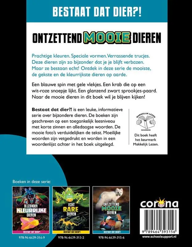 Bestaat dat dier?! is een leuke, informatieve serie over bijzondere dieren. De boeken zijn geschreven op een toegankelijk leesniveau met korte zinnen en alledaagse woorden. De mooie foto’s verduidelijken de tekst. Moeilijke woorden zijn vetgedrukt en worden in een woordenlijst achter in het boek uitgelegd.