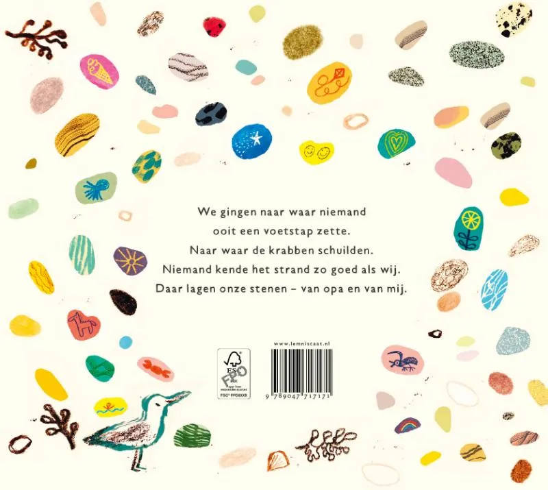 Opa wist altijd de beste weg naar het kiezelsteenstrand, door het wiebelbos, langs de treinen en de hondjes. En als ze het duin beklommen, roken ze de zee al. Op het strand ontmoetten ze een zeehond, vonden ze hout van een piratenschip en aten ze smeltende ijsjes… en elke keer voordat ze vertrokken, kozen ze allebei een kiezelsteentje om mee naar huis te nemen. Maar toen moest opa verhuizen.