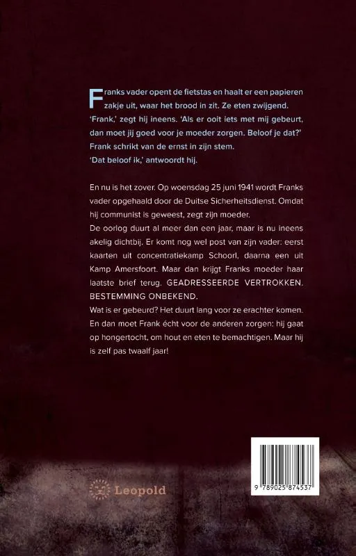 De oorlog duurt al meer dan een jaar, maar is nu ineens akelig dichtbij. Er komt nog wel post van zijn vader: eerst kaarten uit concentratiekamp Schoorl, daarna een uit Kamp Amersfoort. Maar dan krijgt Franks moeder haar laatste brief terug. GEADRESSEERDE VERTROKKEN. BESTEMMING ONBEKEND.<br>
