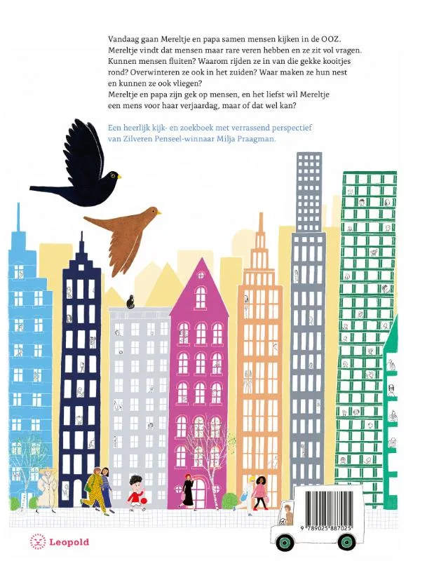 Vandaag gaan Mereltje en papa samen mensen kijken in de OOZ. Mereltje vindt dat mensen maar rare veren hebben en ze zit vol vragen. Kunnen mensen fluiten? Waarom rijden ze in van die gekke kooitjes rond? Waar maken ze hun nest en overwinteren ze ook in het zuiden? Mereltje en papa zijn gek op mensen, en het liefst wil Mereltje een mens voor haar verjaardag, maar of dat wel kan?