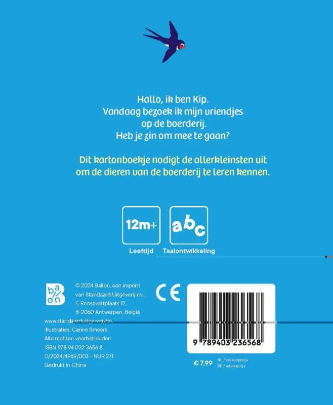 Hallo, ik ben Kip. Vandaag bezoek ik mijn vriendjes op de boerderij. Heb je zin om mee te gaan? Dit kartonboekje nodigt de allerkleinsten uit om de dieren van de boerderij te leren kennen.