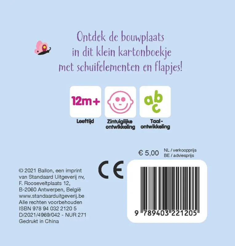 Ontdek de bouwplaats in dit klein kartonboekje met schuifelementen en flapjes!Dit boekje past perfect in een peuterhand. Het is dan wel klein, maar er valt heel wat in te beleven. Kinderen ontdekken de bouwplaats door de flapjes te openen en de schuifmechanismes te activeren. Ideaal om de fijne motoriek en de hand-oogcoördinatie te bevorderen.